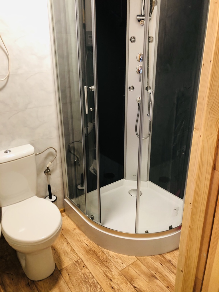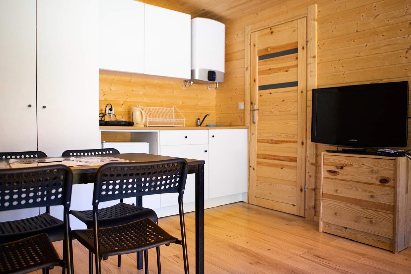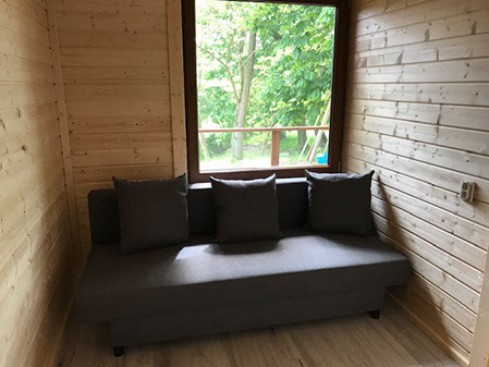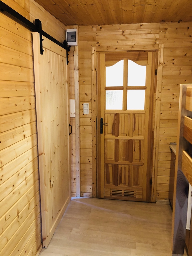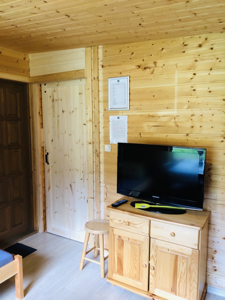 W domku znajdują się 2 pomieszczenia 1) jeden duży salon z aneksem kuchennym , stołem z 4 krzesłami, łóżkiem podwójnym i rozkładaną kanapą oraz TV 2) łazienka z toaletą i prysznicem oraz taras. Aneks kuchenny wyposażony jest w małą lodówkę, kuchenkę elektryczną nablatową, czajnik elektryczny, patelnię, 3 garnki , durszlak, miska, zestaw talerzy, sztućców oraz szklanek. Łóżko wyposażone jest w pościel. Papier toaletowy, płyn do mycia naczyń i worki na śmieci znajdują się na stanie domku. Prosimy o zabranie ręczników , mydła oraz ewentualnie akcesoriów plażowych.