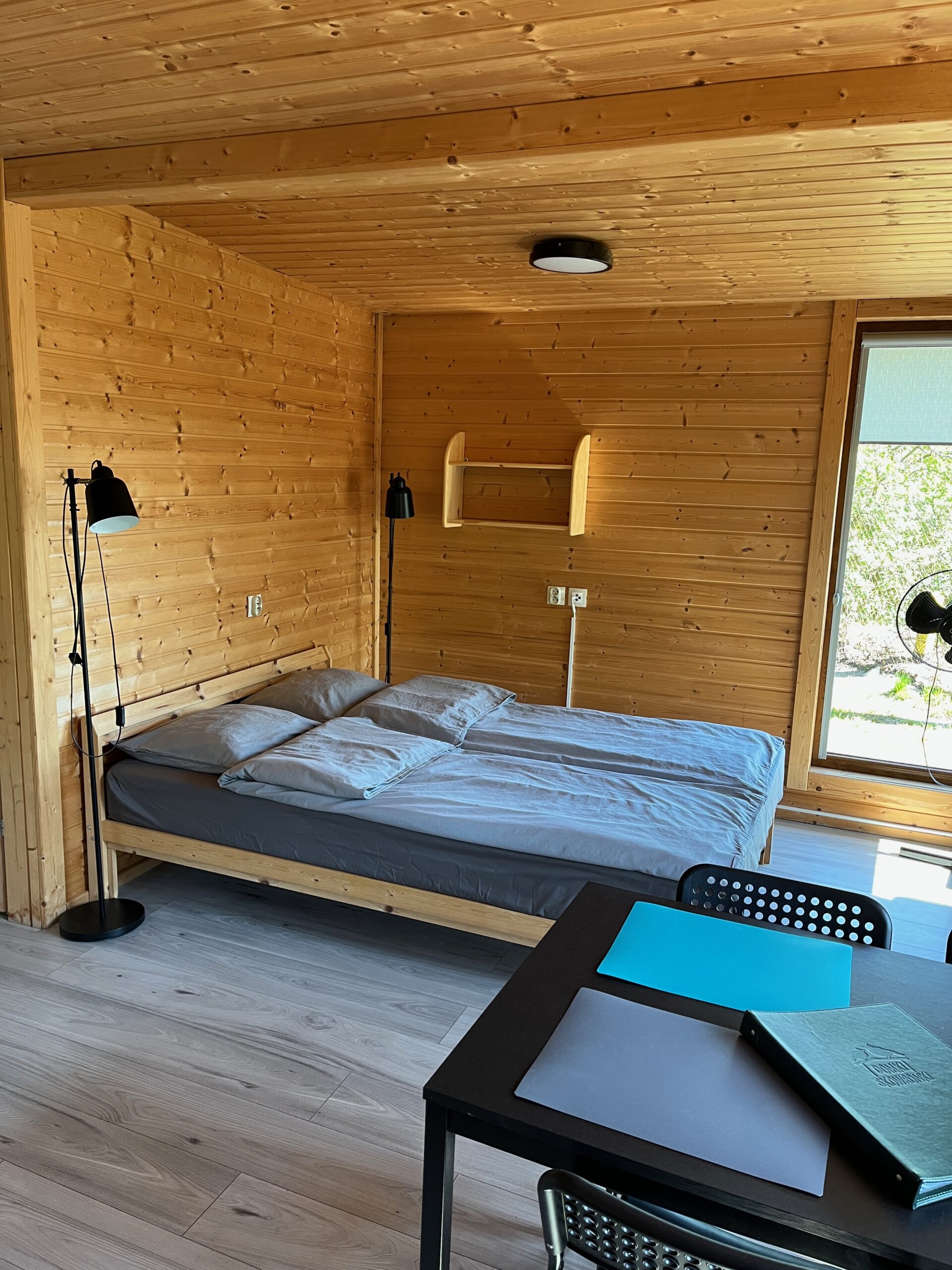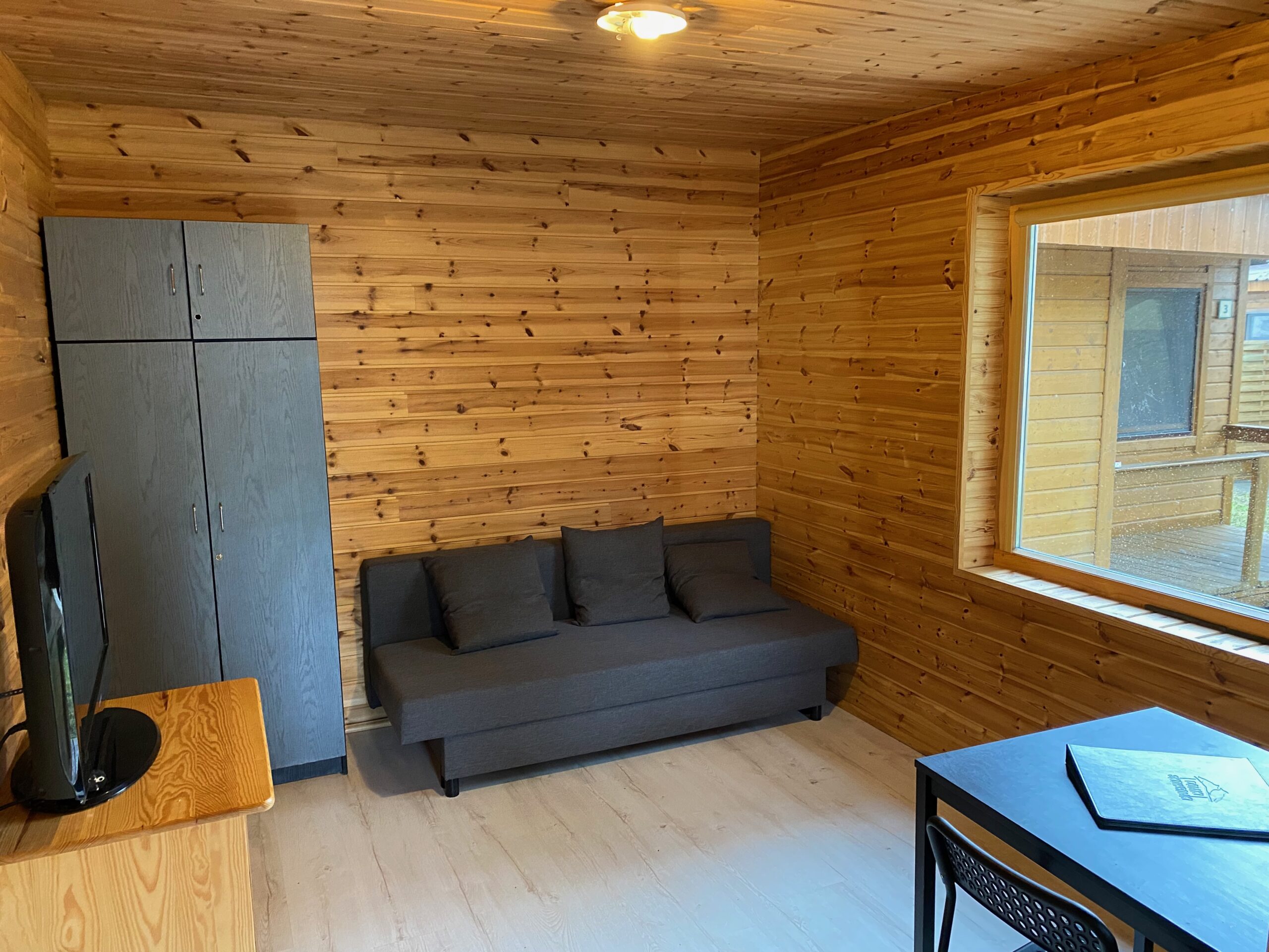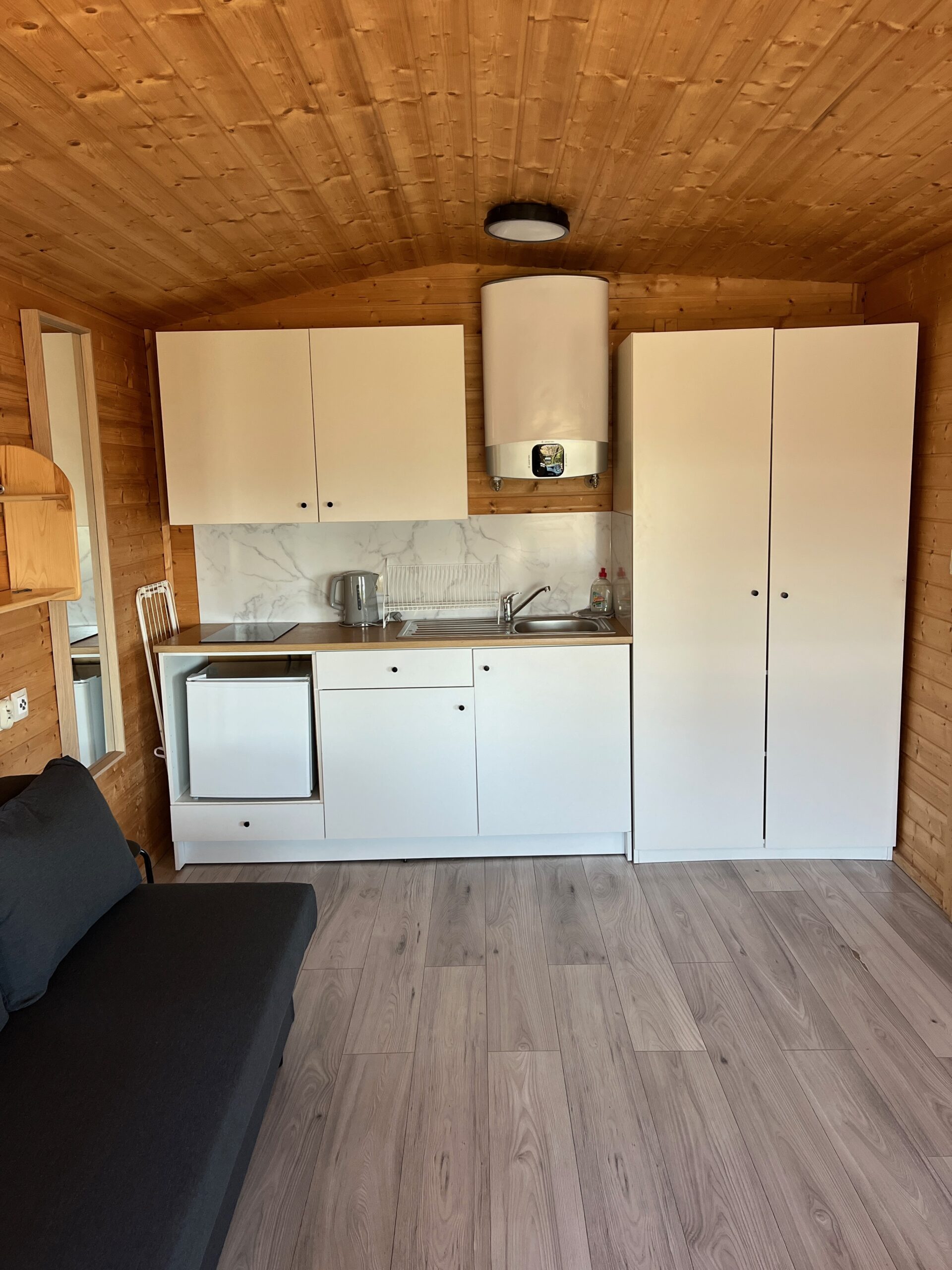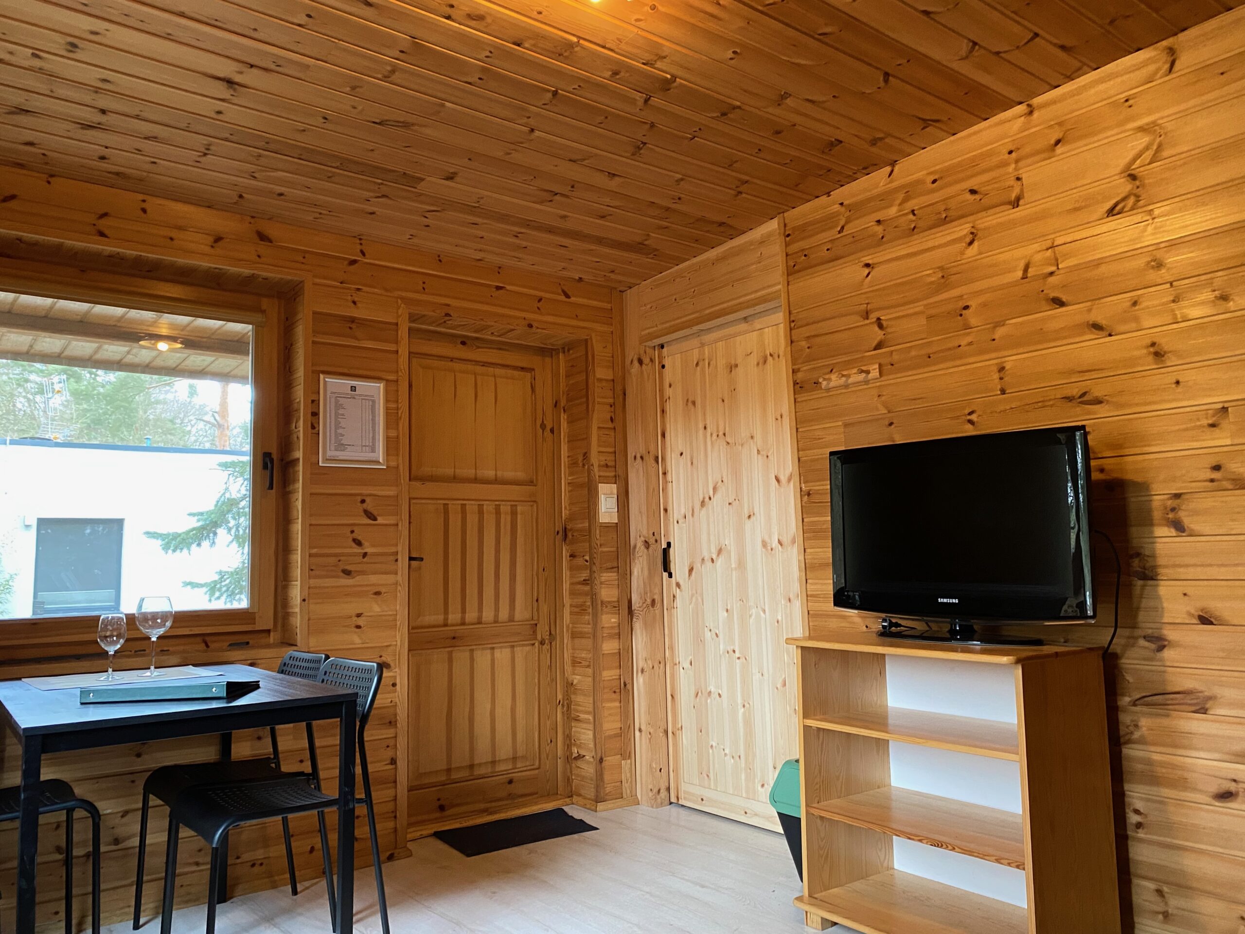 W domku znajdują się 2 pomieszczenia 1) jeden duży salon z aneksem kuchennym , stołem z 4 krzesłami, łóżkiem podwójnym i rozkładaną kanapą oraz TV 2) łazienka z toaletą i prysznicem oraz taras. Aneks kuchenny wyposażony jest w małą lodówkę, kuchenkę elektryczną nablatową, czajnik elektryczny, patelnię, 3 garnki , durszlak, miska, zestaw talerzy, sztućców oraz szklanek. Łóżko wyposażone jest w pościel. Papier toaletowy, płyn do mycia naczyń i worki na śmieci znajdują się na stanie domku. Prosimy o zabranie ręczników , mydła oraz ewentualnie akcesoriów plażowych.